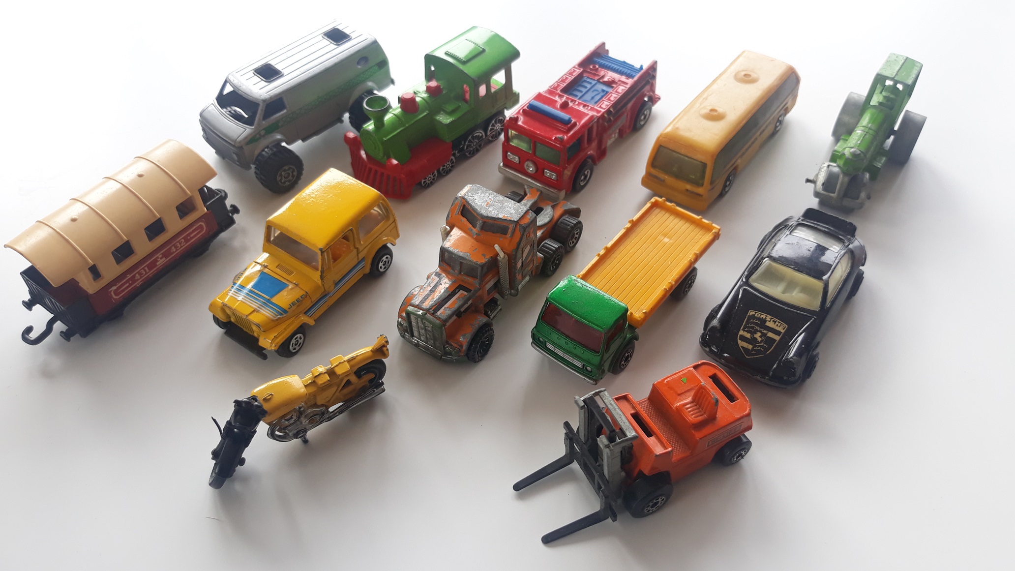 12 x Assorted Vehicles (Train, Forklift, Fire Engine, Car, Motorbike, Roller, Bus, Kenworth, Cattle Truck, Train Carriage, Van, Jeep)